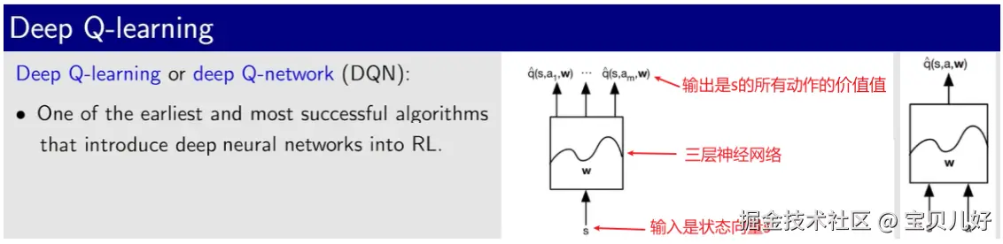1、DQN的逼近函数(1)上图最右边的逼近函数是Q-learning with function approximation的逼近函数,这里的function一般是linear function,输入是(s,a)向量,输出q(s,a)值。