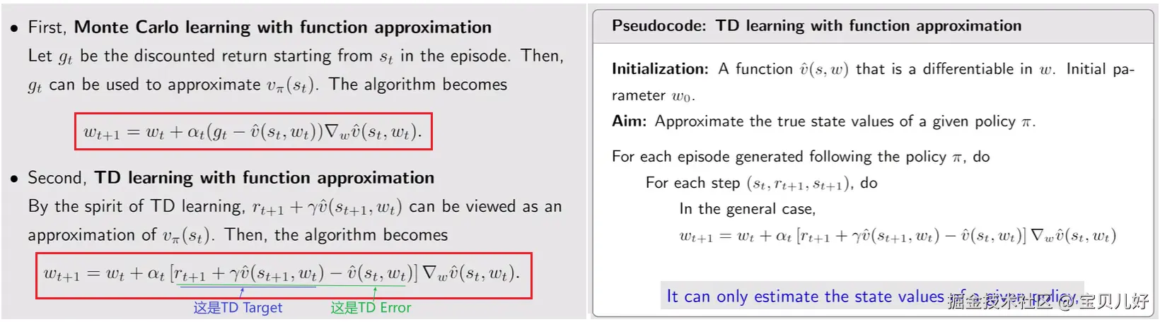 (2)用TD learning来代替vп(st)。右边是伪代码。TD learning更新w时,用的是Trajectory经验数据,用每个step数据来更新w的。也所以TD learning with function approximation其实是在minimize Bellman error的。MC是最小化true value error的。