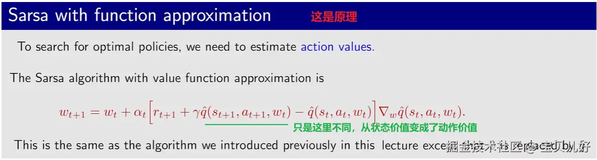 1、前面我们用function approximation估计的是状态价值值。下面我们开始估计动作价值,下面是逼近函数的迭代原理: