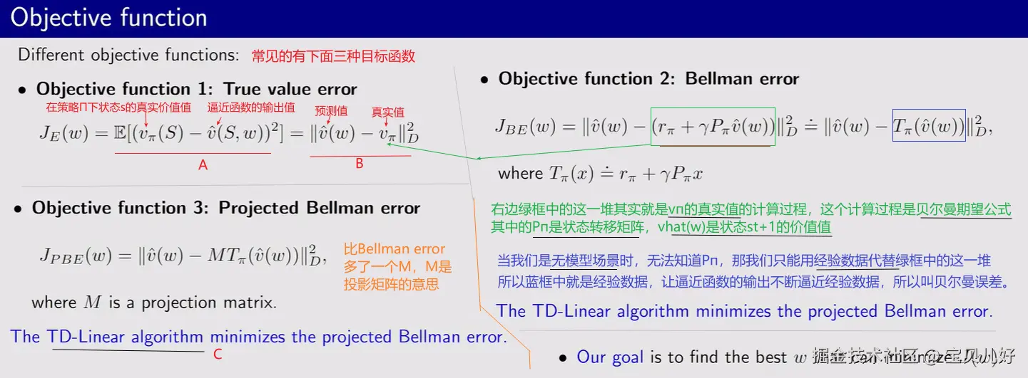 (3)上图的objective function3叫贝尔曼投影误差Projected Bellman error。只是在Bellman error的前面加了一个投影矩阵M。我们知道矩阵的作用就是变换维度空间。当Bellman error无法被最小化到接近0时,我们加一个投影矩阵就可以了!就这么简单。就是如果你的逼近函数永远也无法逼近你的经验数据时,给逼近函数前面乘以一个M矩阵,就是把逼近函数的结果投影到另外一个空间,这样目标函数就可以最小化到0了。