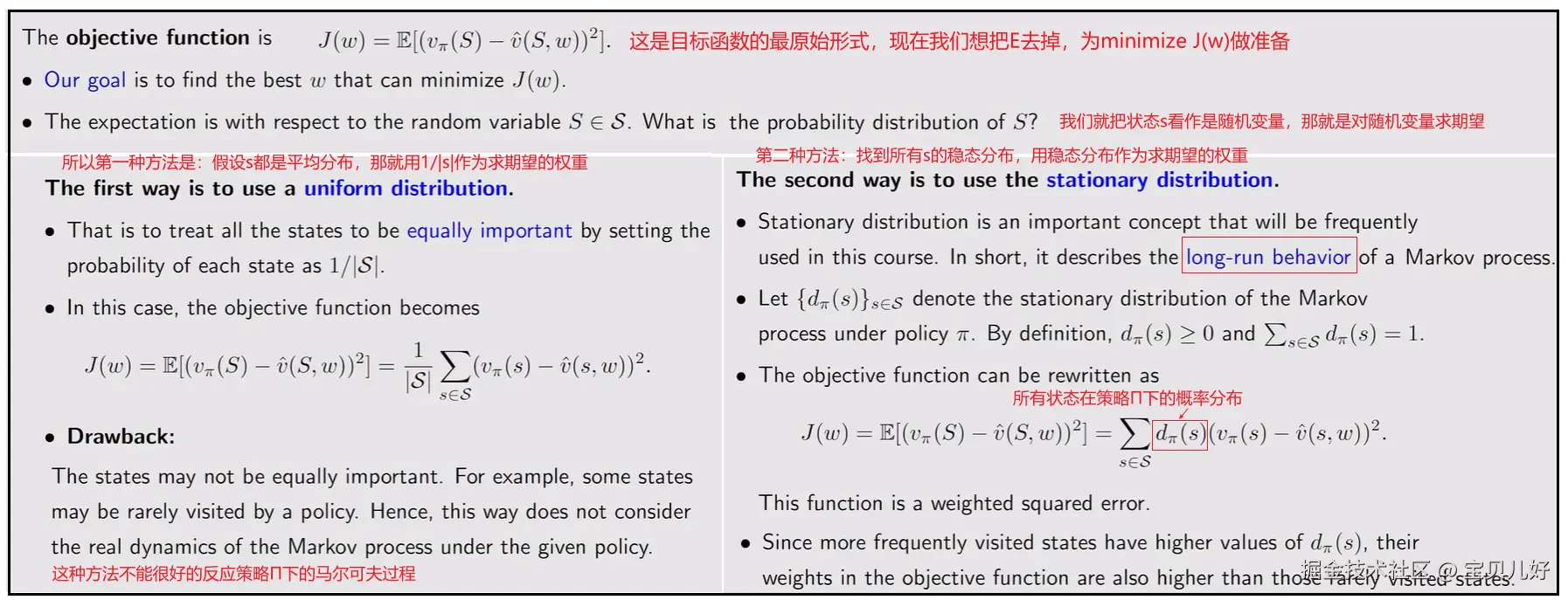 一是要把A处的期望E给展开。上图B处,就是把A处的求期望E给展开了,所以就变成求vhat(预测值)和v(真实值)的求模了。脚标D表示求模时的权重。D具体表示什么样的权重呢?下面我们会讲uniform distribution和stationary distribution两种权重,就是D的具体表示。