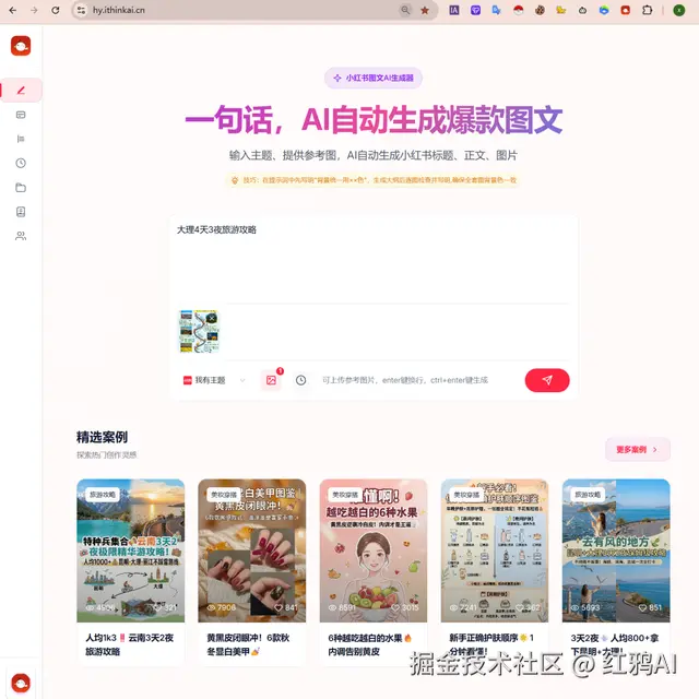 【红鸦 AI:**hy.ithinkai.cn**】正是为了解决“高效产出高质量图文”而生的。它最老练的地方在于,能把原本需要几小时的策划、文案、作图流程,压缩进一个极简的工业化路径里。
