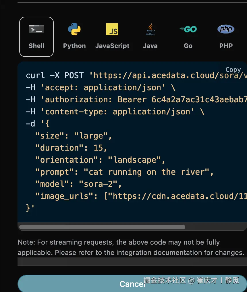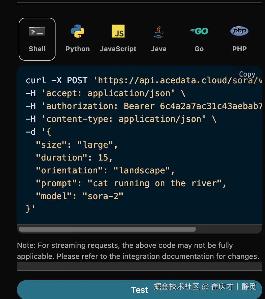 另外如果想生成对应的对接代码,可以直接复制生成,例如 CURL 的代码如下: