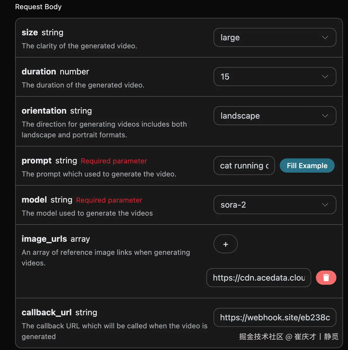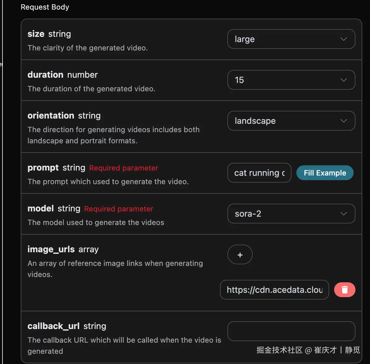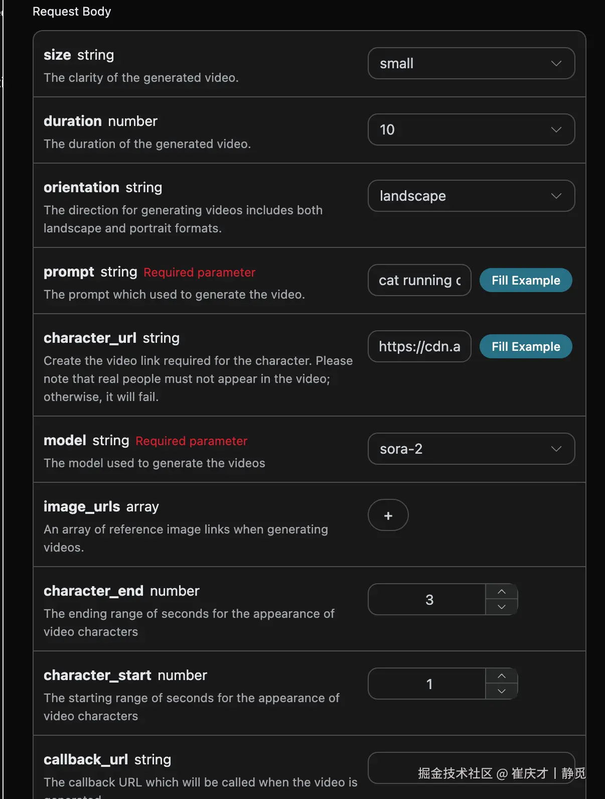 model:生成视频的模型,主要有sora-2、sora-2-pro,目前sora-2、sora-2-pro可以自主选择size、duration参数的视频,其中sora-2-pro可以支持duration为25s的视频,而sora-2只支持10、15秒的视频。size:此次视频生成任务的清晰度,分别有small、large。image_urls:需要上传的参考图片链接或者Base64编码数组。duration:此次视频生成任务的时长,分别有10s、15s、25s,目前只有sora-2-pro支持25s。character_start/character_end:角色在画面中的起止位置(0-1),用于控制主体位置。orientation:画幅方向,支持landscape、portrait、square。prompt:提示词。callback_url:需要回调结果的URL。
