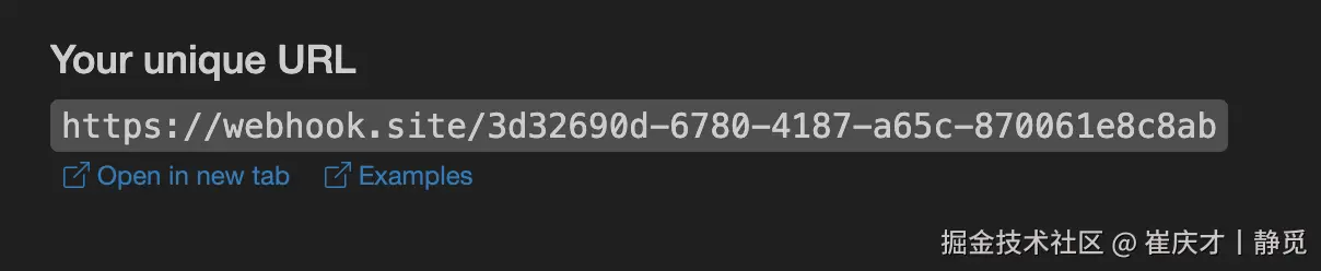 将此 URL 复制下来,就可以作为 Webhook 来使用,此处的样例为 https://webhook.site/eb238c4f-da3b-47a5-a922-a93aa5405daa。