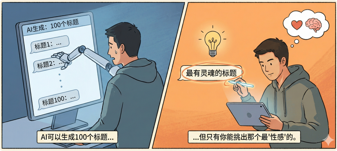 - 审美: 你知道什么是好的,什么是有灵魂的,什么是能打动人的。AI可以生成100个标题,但只有你能挑出那个最“性感”的。AI可以写出一段跑通的代码,但只有资深程序员能判断这代码是不是“优雅”、好维护。