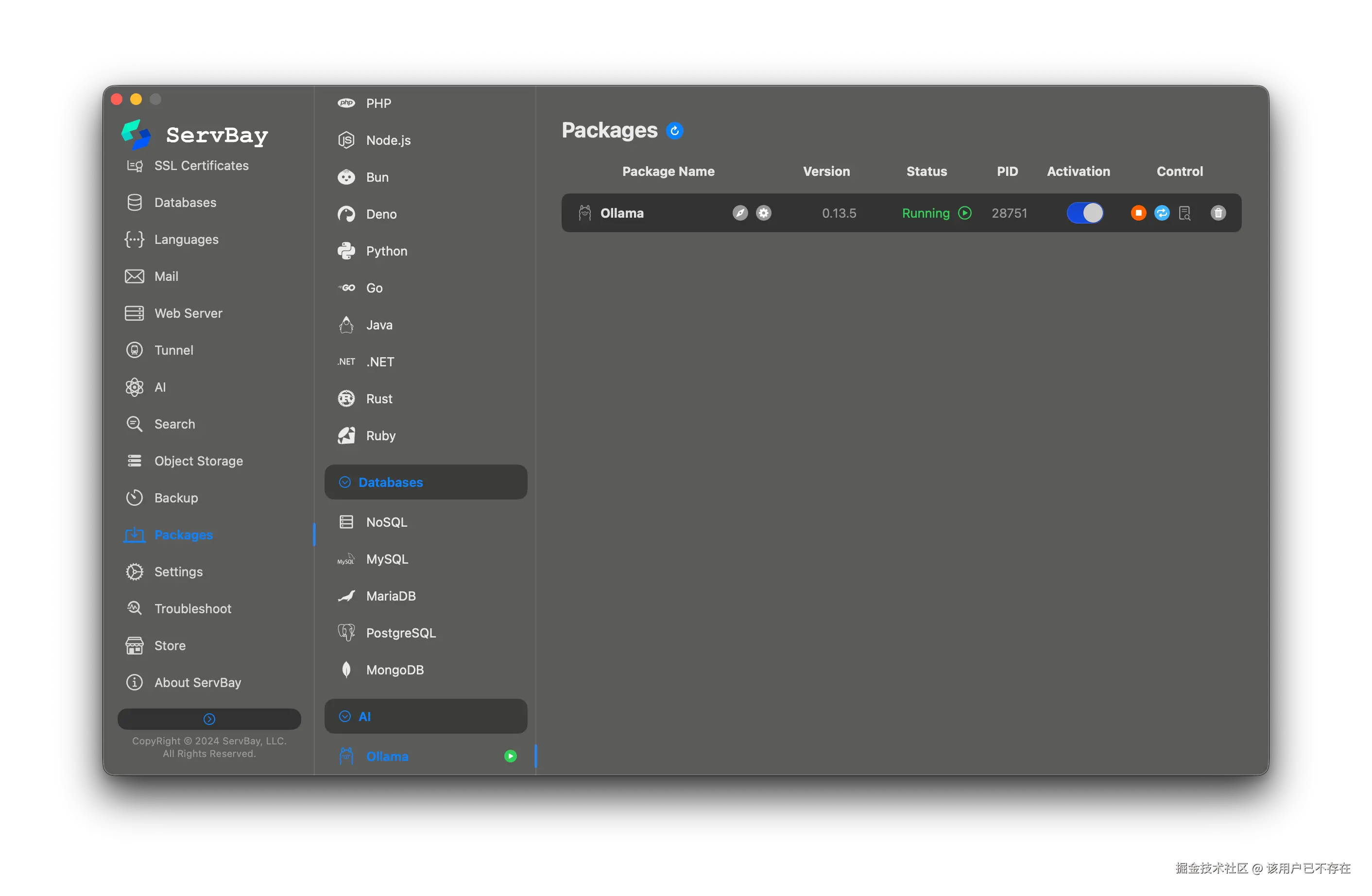 ServBay 目前也已支持了一键安装 Ollama,就不用管命令行依赖和配置环境变量,直接在 ServBay 的管理界面中即可完成 Ollama 的部署与服务启动。配合其提供的兼容 OpenAI 格式的 API,对于不需要极高并发的中小型内部工具,使用“ServBay + Ollama”作为后端推理引擎是一个极低维护成本的选择。