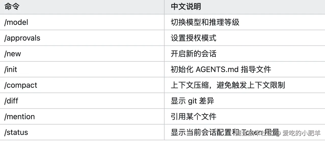 Codex内置了一套快捷命令系统。在会话中输入/就能看到所有可用命令。最常用的有三个——输入/model切换模型和推理等级,输入/new开启新会话,输入/status查看Token用量。想看更多?输入/就能把全部命令响光一遍。熟记这几个常用的,能推高工作效率。