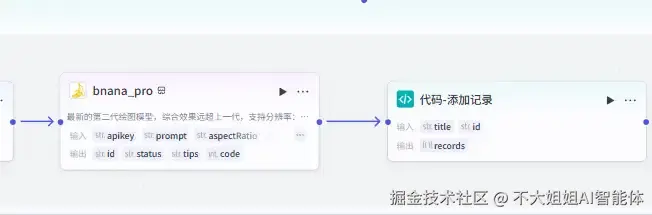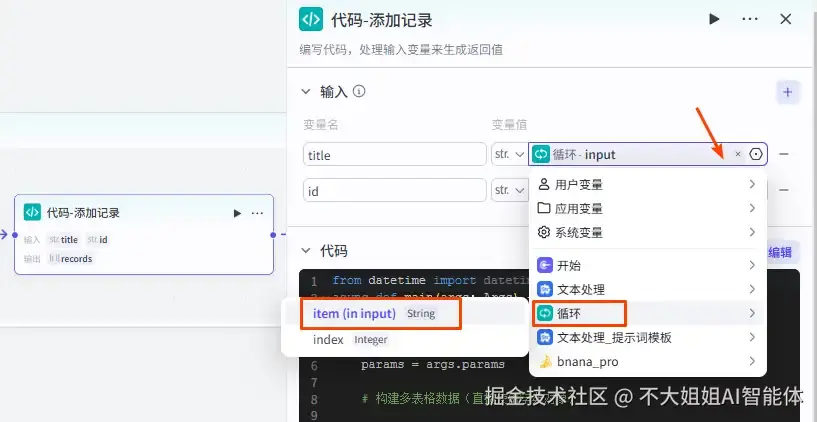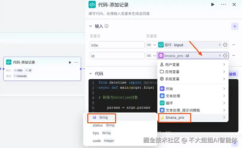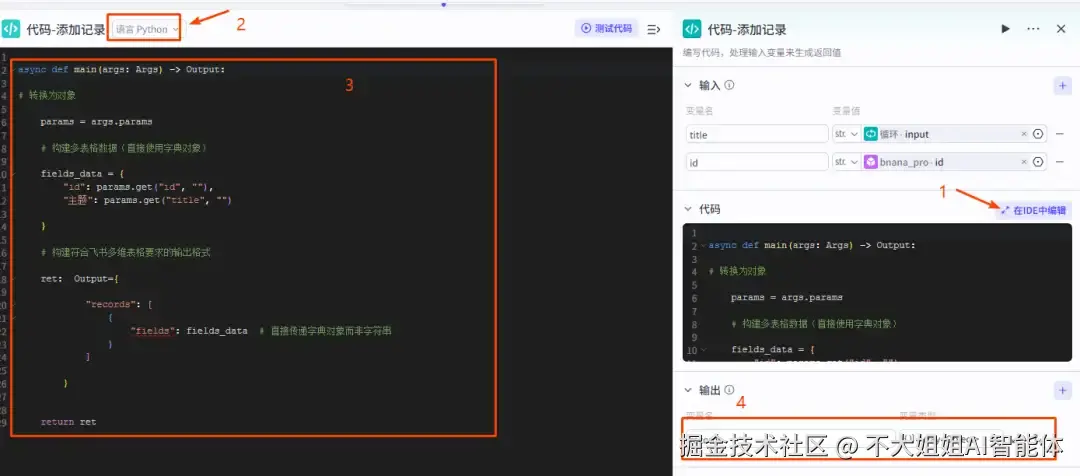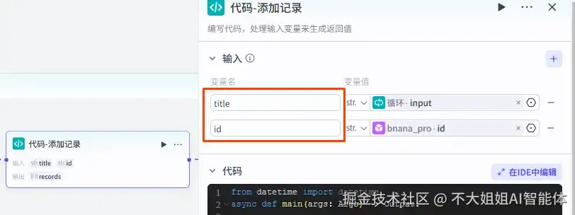 在【bnana_pro】后添加,重命名为添加记录,输入代码并进行设置和输出(语言选 python)。
