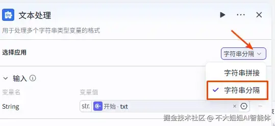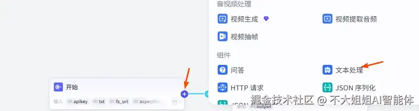 在【文本处理】组件后添加设置,输出设置暂不设置。
