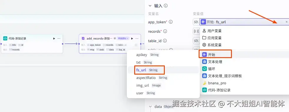 在【代码】模块后添加,重命名为添加记录,进行插件设置,其他留空,连接到【循环体】 的右边。