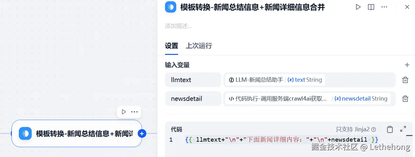 使用模板转换节点(或文本拼接)将 LLM 生成的摘要和之前获取的新闻详细内容合并,以便后续流程使用。假设我们有两个变量 llmtext(LLM 输出的总结文本)和 newsdetail(详细新闻文本),可以构造如下模板表达式: