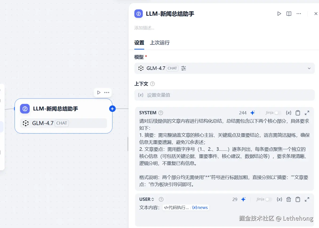 在获取到新闻列表和详情后,接下来使用 LLM 节点对新闻进行结构化总结。本例中我们选择调用前面配置的 GLM-4.7 模型。请向模型提供如下提示词(prompt):