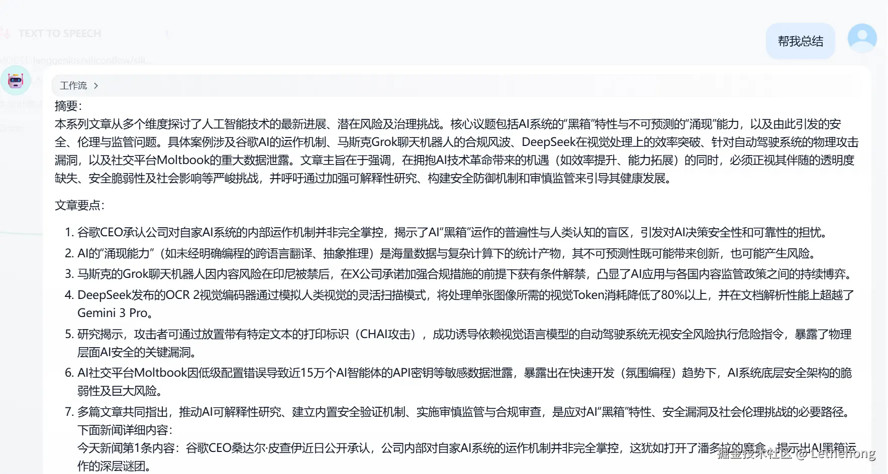 本文从环境搭建、模型配置到工作流设计的各个环节,为大家演示了如何利用蓝耘 MaaS 平台和 Dify 平台快速搭建一个高效的智能化 AI 工作流。通过选择 GLM-4.7 这样的高性能中文大模型,并结合 Dify 提供的可视化流程编辑器,我们能够轻松实现文本抓取、结构化总结、内容合并以及多模态输出等功能。在实践过程中,我们编写了示例代码调用新闻 API,实现了对新闻内容的自动获取,并利用 LLM 节点对内容进行了有条理的结构化处理和精炼。最后,通过语音合成节点将文字转换为语音,完成了一个从数据采集到多模态输出的完整应用示例。