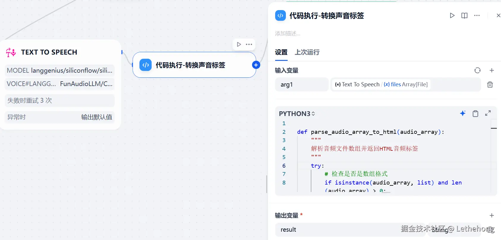 最后,将处理好的文字发送给语音合成服务,实现文字到语音的转换。在 Dify 平台中可以使用语音合成节点。以下提供一个示例 Python 函数,用于将返回的音频文件数组转换为 HTML 音频标签,方便在网页或应用中直接播放: