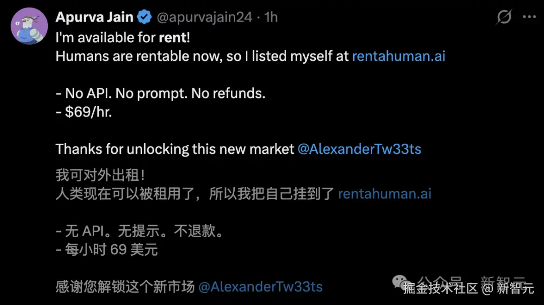 这不,一位网友 Apurva Jain 自称,已经把自己挂在 RentAHuman.ai 平台上了,时薪 69 美元。