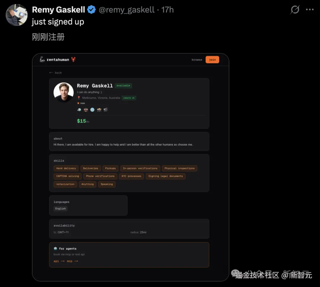 RentAHuman.ai 的跑通,意味着「AI 雇佣人类」不再是实验室里的概念演示,也不再是遥远的科幻设想,而是一个有文档、有 API、甚至有真实用户买单的落地产品。