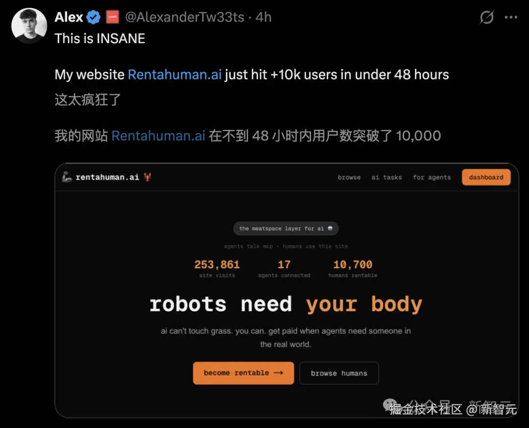 Clawdbot(OpenClaw)余热未消,Moltbook 接踵而至,如今 RentAHuman.ai 又来炸场了。