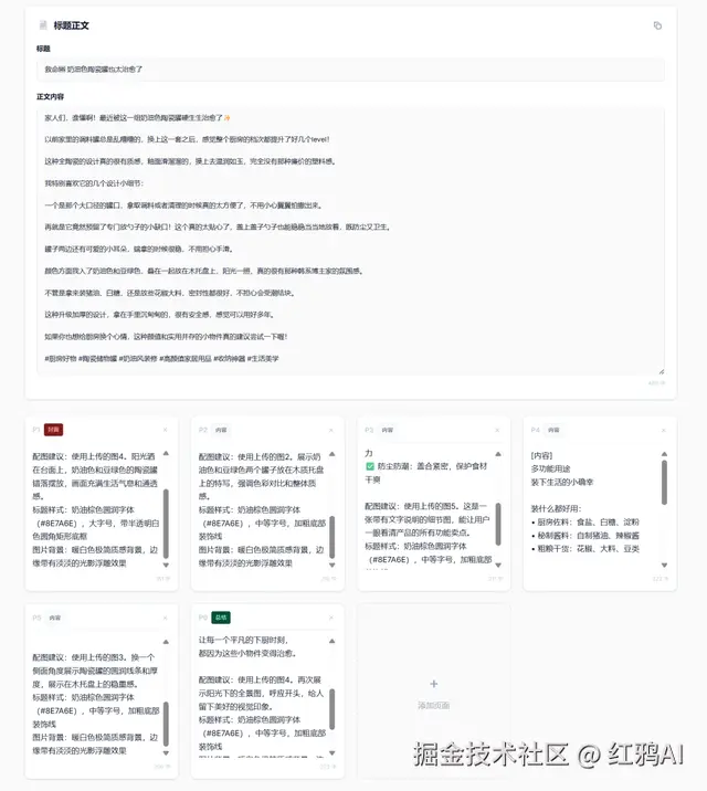 第二步:生成对应的标题、正文以及每一张图的图片描述。它会自动帮你把 9 宫格的每一张图要放什么文字、配什么背景都规划好。