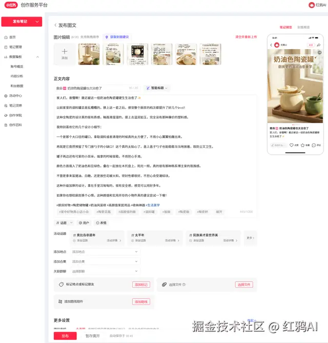 第四步:支持手机端、浏览器一键发布。预览没问题后,直接保存发小红书,这种效率是一个人打理 10 个号的底气。