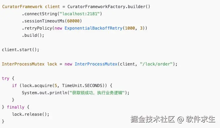 下面用 Java + Curator(最常用客户端)演示一个经典场景。