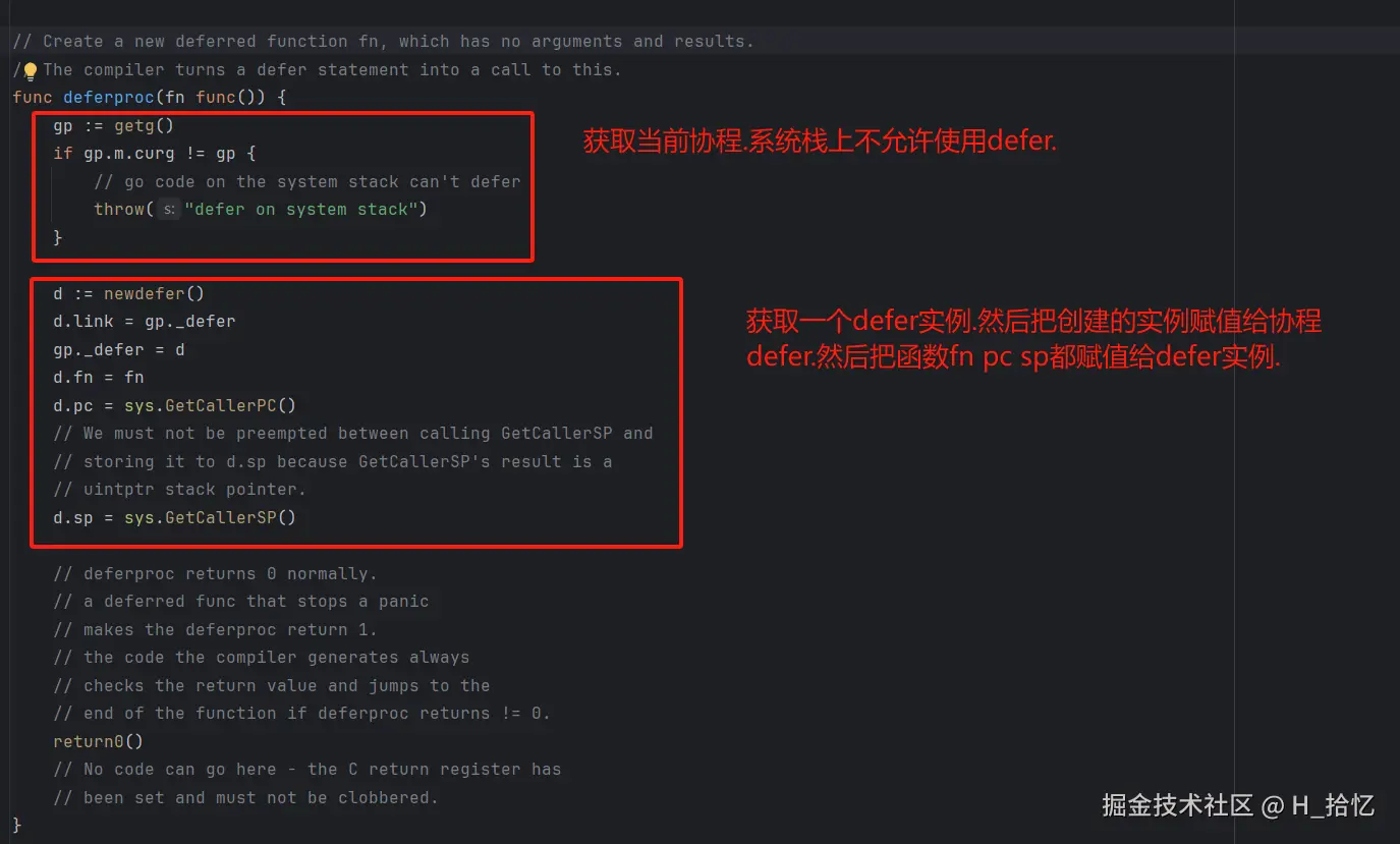 是deferproc()函数.对于栈defer而言则是deferprocStack()函数.只能由运行时调