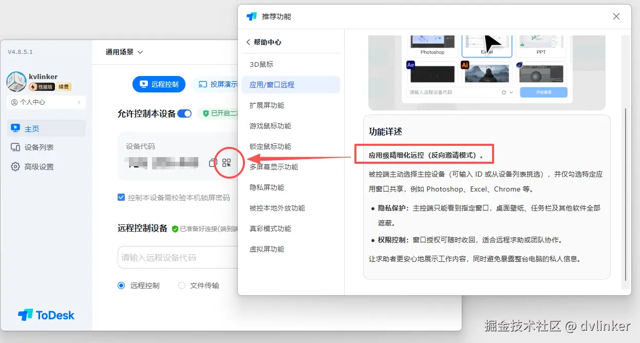 ToDesk反向****邀请模式的隐私保护:这个是自己作为被控(求助者),提供给被邀请人(求助对象)远控自己设备的权限控制,主控端只能看到被控端勾选的特定窗口或应用,避免暴露整台电脑的私人信息,这一点是真的很贴合某些远程求助或团队协作的场景了!