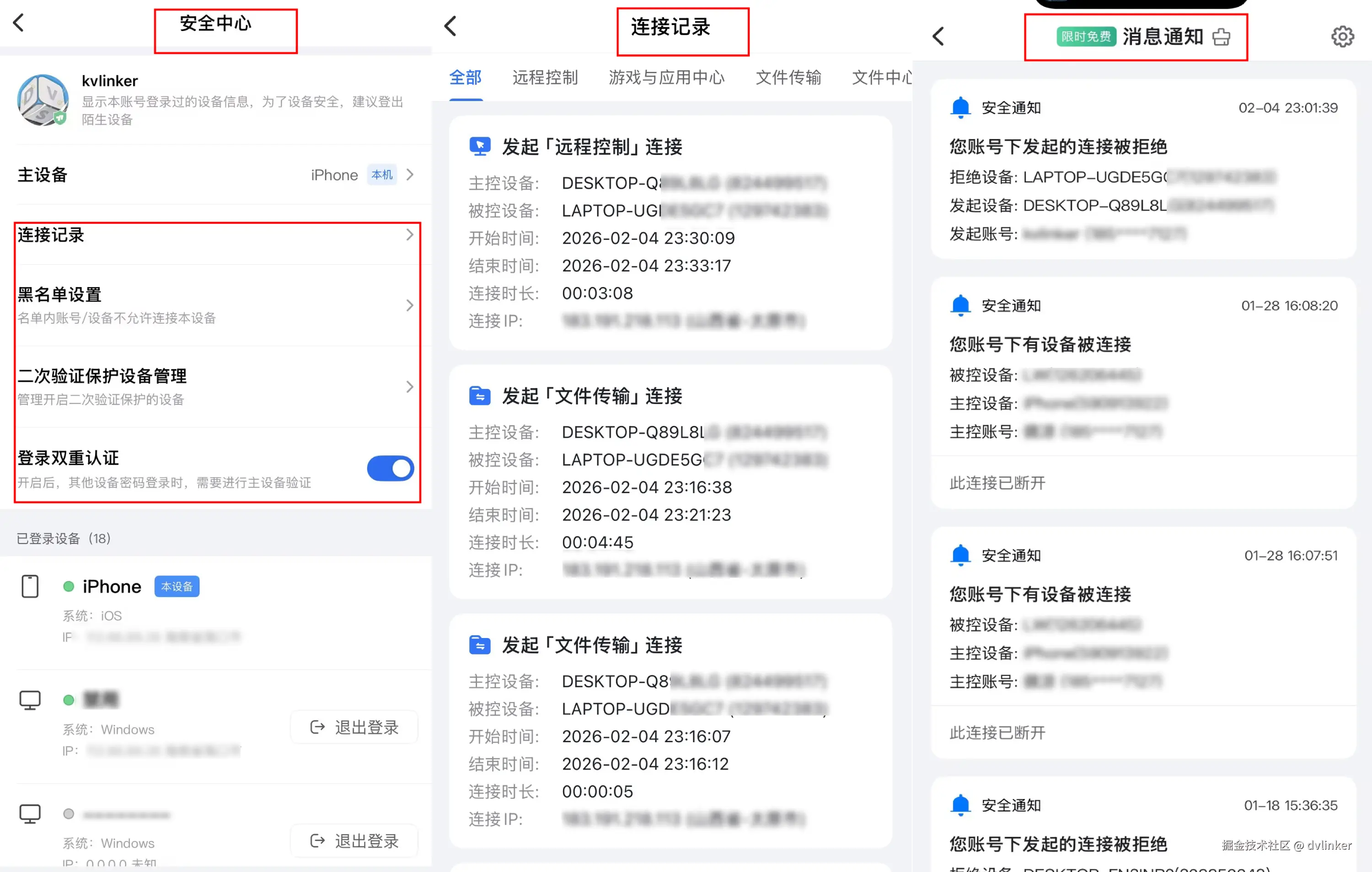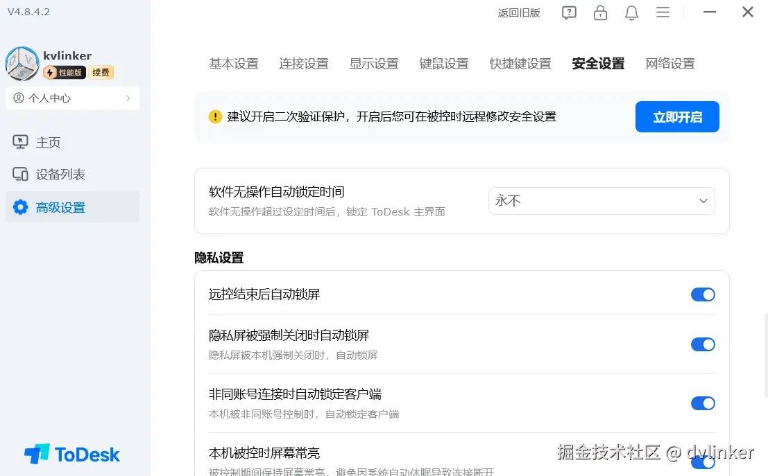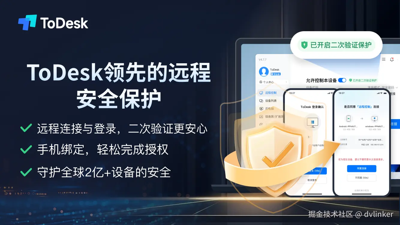 - ToDesk 的“二次验证”与“主设备”体系:ToDesk的功能设计极具场景化特色。其“二次验证”功能开启后,任何新连接都必须经过绑定的主设备(通常为手机)手动点击同意。这实质上是将2FA的验证载体从一次性密码(OTP)固化为一台受信任的物理设备,实现了对每一次连接的实时审批。其移动端的“24小时防诈等待期”更是创新之举,强制新设备首次连接需等待或旧设备授权,为防范诈骗诱导提供了宝贵的缓冲时间。
