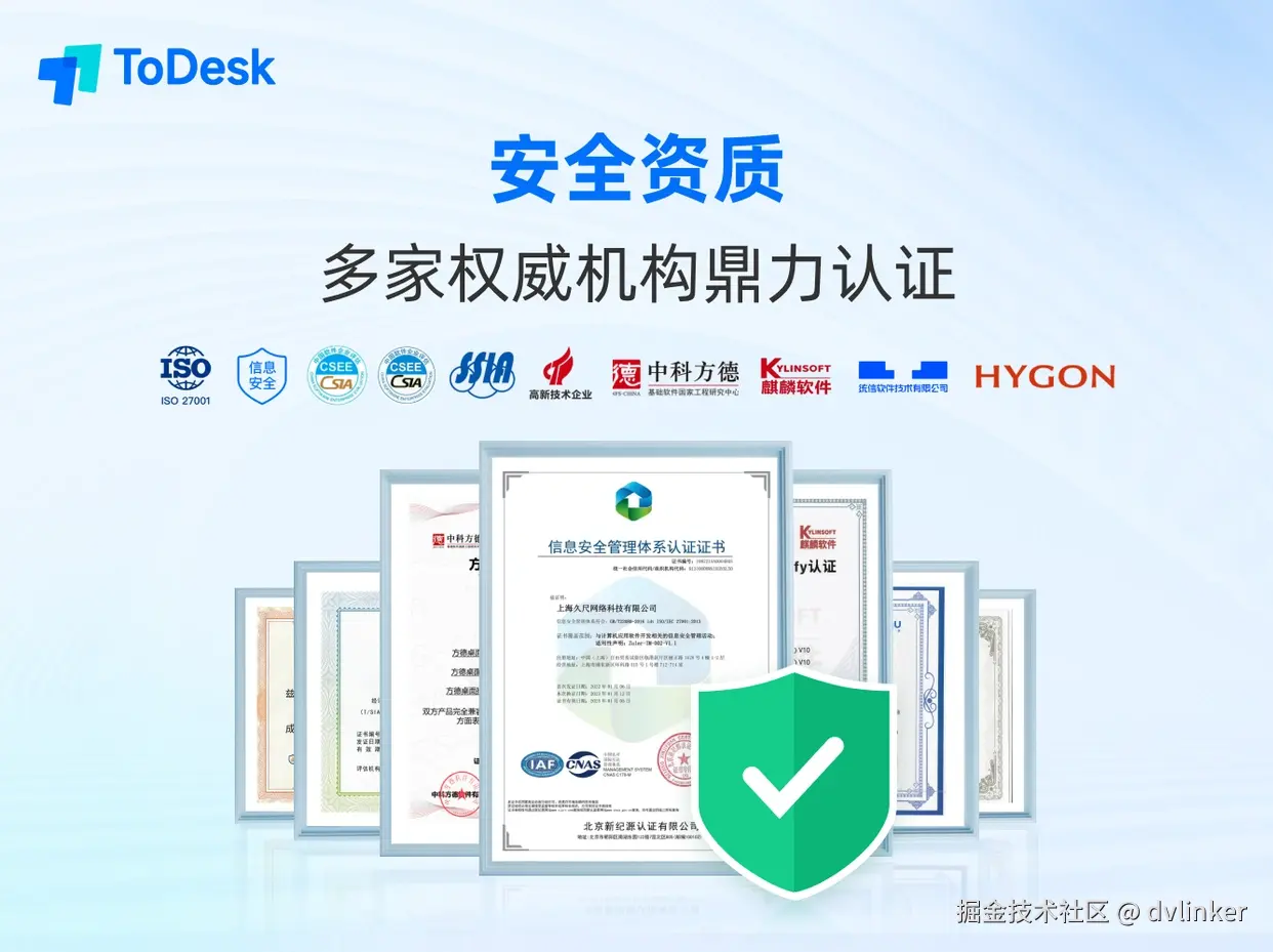 - ToDesk通过了ISO27001信息安全管理体系认证、ISO20000信息技术服务管理体系认证以及国内非涉密系统最高级别的等保三级认证,充分证明其在数据保护、服务稳定和安全管理上的合规能力。此外,ToDesk还获得了国家工信部认证、麒麟软件认证、统信认证、中科方德认证、质量管理体系等多重权威认证,进一步证实了ToDesk远程控制在信息安全和软件安全上的强力保障,全面满足金融、政务等高敏感行业的安全需求。