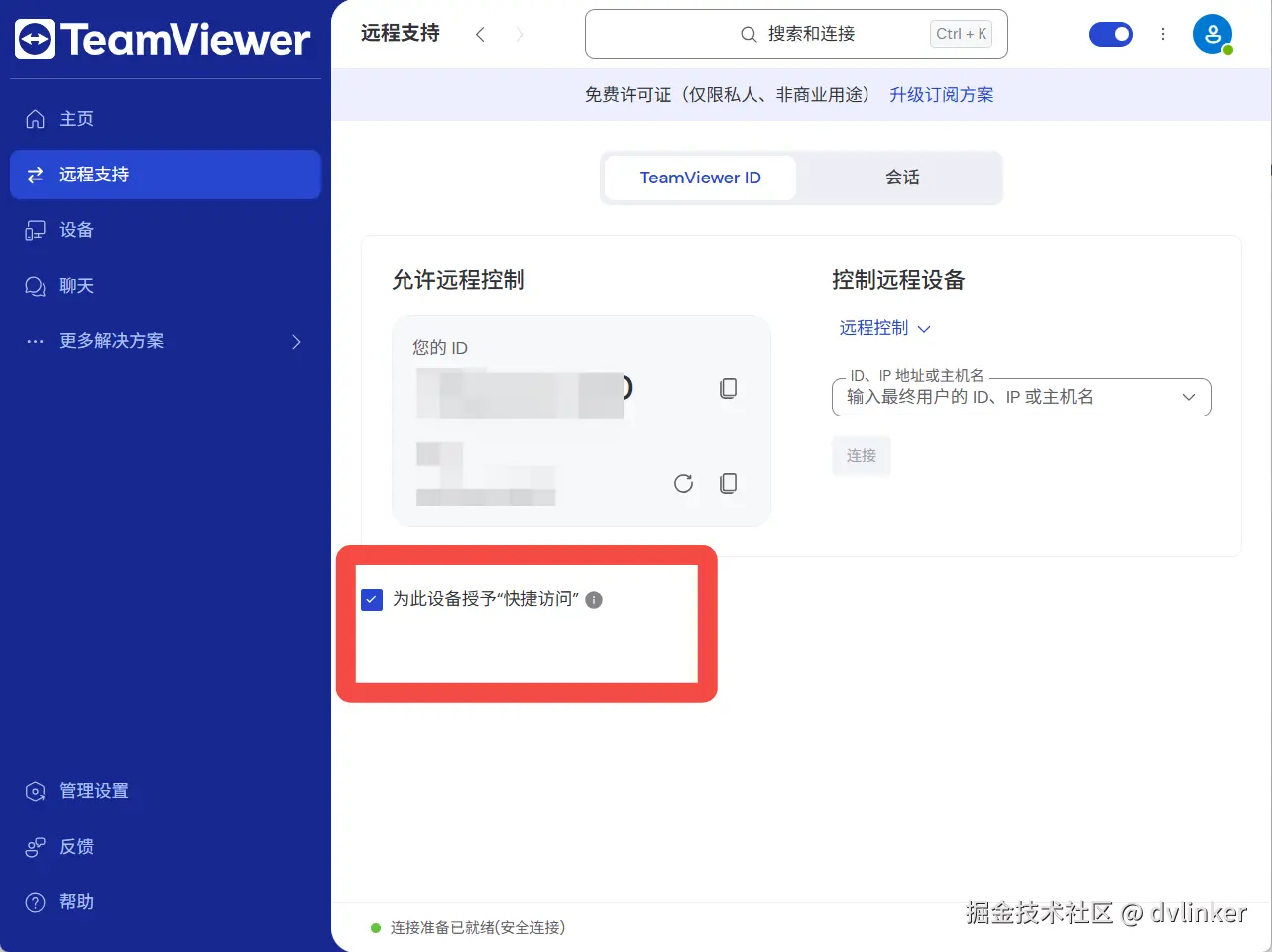 **其“轻松访问”功能更进一步,利用公钥加密技术,允许已信任的账户在无人值守场景下无需输入密码即可安全连接,实现了安全的无密码化访问。**本模式也需使用TeamViewer账户,且本地和远程端都需要登录,授权轻松访问模式之后,只要是自己的账号,本地就可以直接访问远程端(也是自己账号登录)的电脑,这一功能的前提是要自己做好账号安全防范。