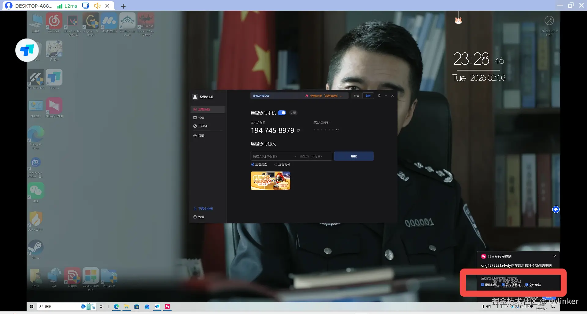 - TeamViewer与向日葵:提供了“识别码远控本机时,需校验验证码并得到本机同意”的双重验证,功能上类似ToDesk的“非同账号需本设备手动同意”,属于基础的连接确认机制。