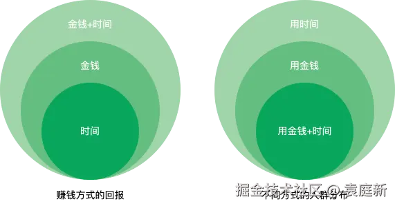这三种赚钱方式的回报是不一样的,它们依次越来越大,最牛的就是用“时间+金钱”赚钱。