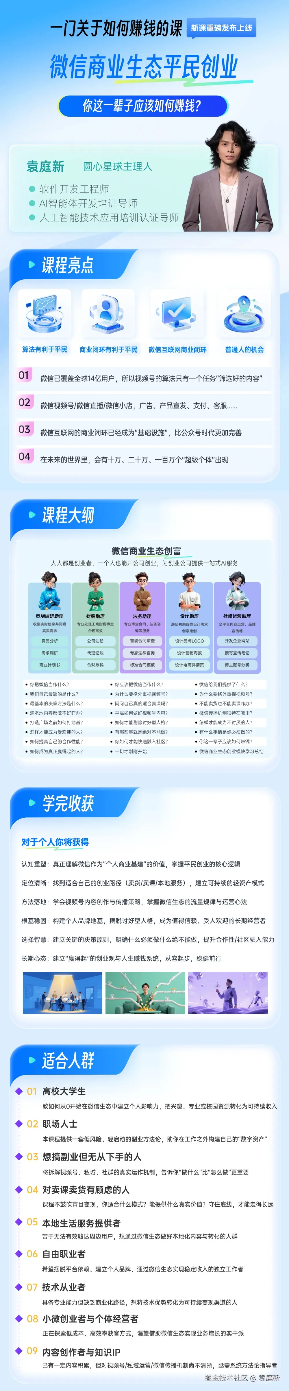 算了算,我已经讲了8年的课了,这些年大大小小讲了60多门课程,但是如果只推荐一门课,毫无疑问那就是这门《微信商业生态平民创业》,竟不是我的编程课。感兴趣的朋友可以通过识别下图开启学习之旅。