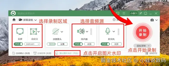 第二步:确定录制模式后,软件会自动跳转至准备设置页面。用户可根据自身需要调节录制区域与音量设置,此外,若需设定视频水印,可点击下方的 【图片水印】 选项进行设置,所有设置完成后,点击 【开始录制】 即可;