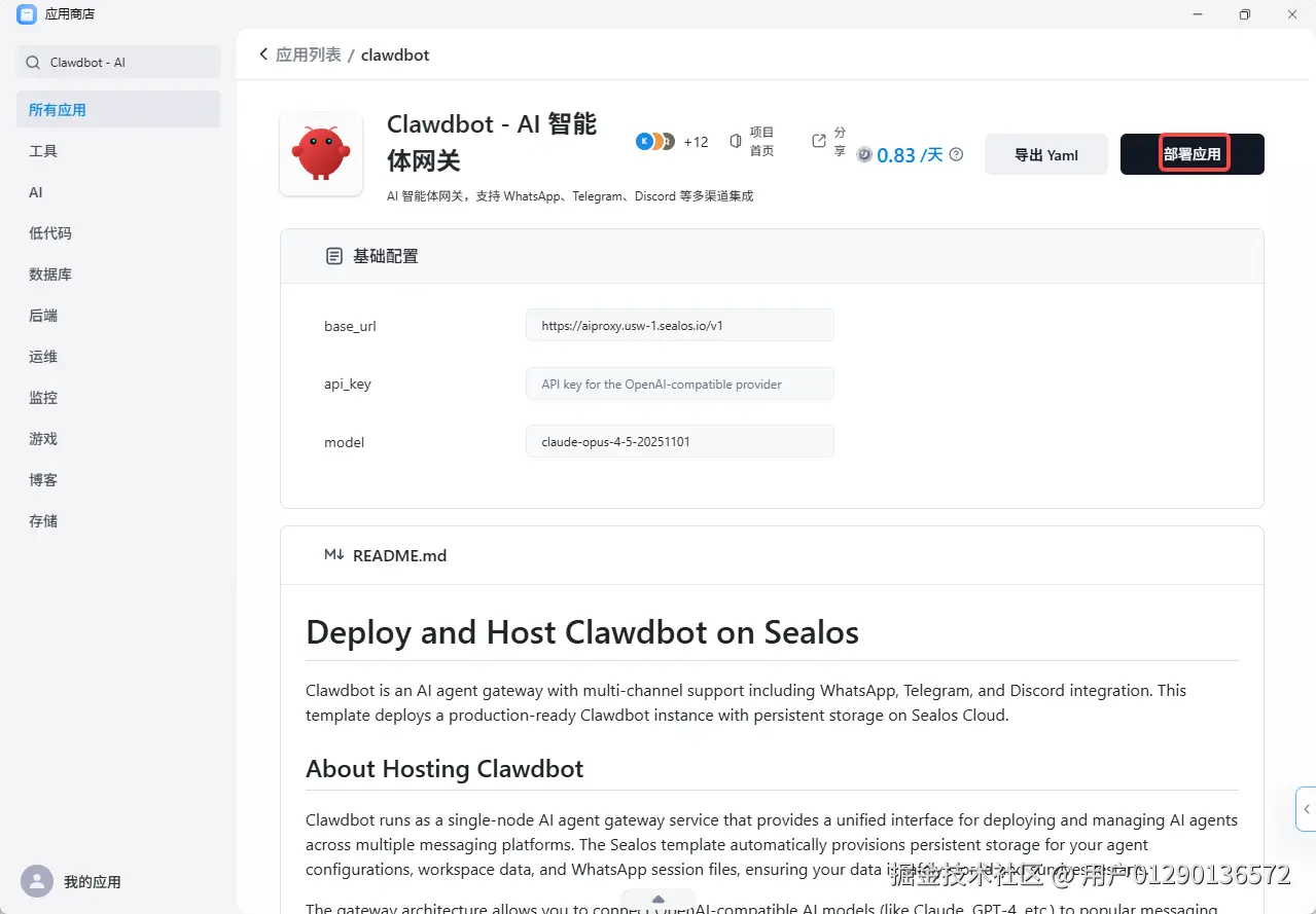 打开Sealos桌面,进入应用商店,搜索"Clawdbot - AI 智能体网关 ****",点击部署。