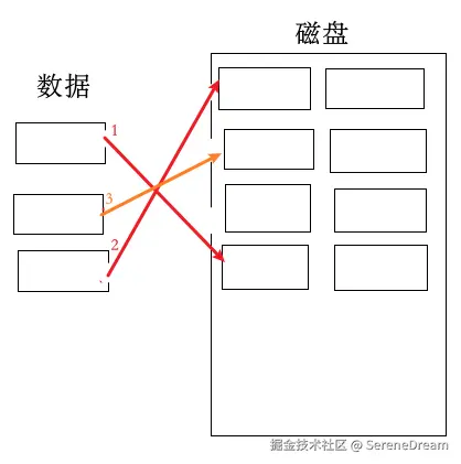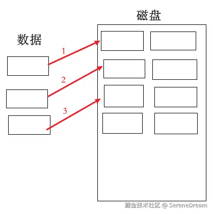 随机:数据在磁盘上非线性存储,比如三个数据采用了不连续的三个块存储。