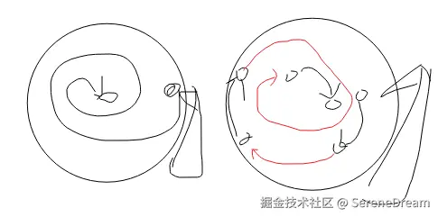 注:黑色圆圈:唱头落点;黑色箭头:唱头划过时在放歌;红色箭头:唱头在找这一句歌词唱完之后的下一句时划过的部分