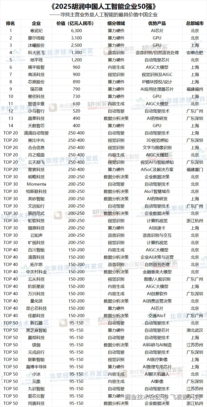 在2026年1月由胡润研究院发布的《2025胡润中国人工智能企业50强》榜单上,呈现了一个令人瞩目的现象:寒武纪以6300亿元价值登顶,紧随其后的是摩尔线程和沐曦股份,包揽了国内AI芯片企业前三甲。