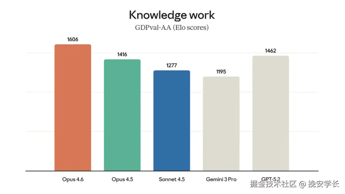 在模拟金融分析、法律审查等知识工作的 GDPval-AA 评估中,Opus 4.6 领先 GPT-5.2 达 144 个 Elo 分。