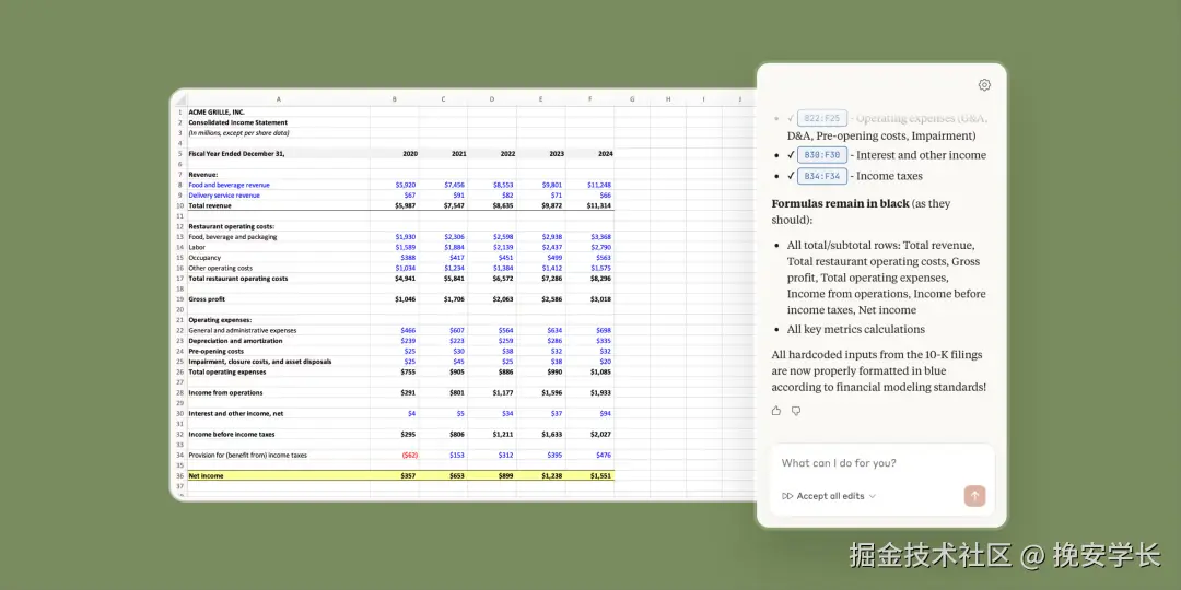 能直接在Excel里摄入凌乱的非结构化数据,自行推断合理的表格结构,一次操作中可处理多个复杂步骤;能铭记你公司的PPT模板,包括字体和布局风格也记住,确保生成的PPT没啥AI味,让老板以为是你熬夜框框一顿做的。