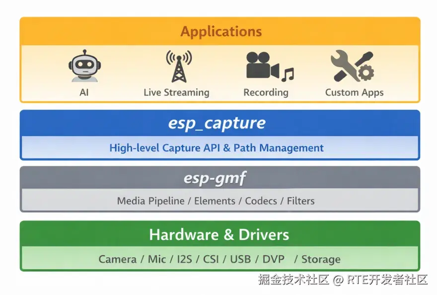 乐鑫科技昨天发布了专为 ESP32 系列芯片打造的多媒体捕获框架——ESP-Capture。该框架基于通用多媒体框架 esp-gmf 构建,将复杂的音视频采集、对齐、编码与封装逻辑整合为一套统一系统,解决了开发者在底层音视频处理中面临的碎片化难题。
