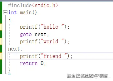 因为goto语句的存在,这几行代码并没有打印world。