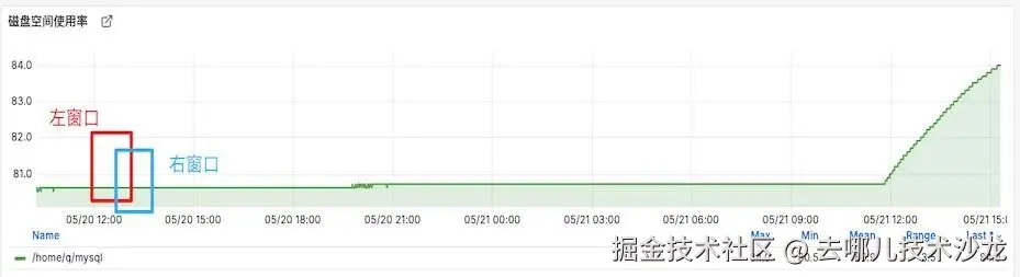 MySQL磁盘使用率一般都是均匀上涨的,如下面监控曲线展示,在红框标识的范围之前,使用率变化非常平稳,对于这种场景,如果使用率突然增加可视为异常,如红框范围内的数据: