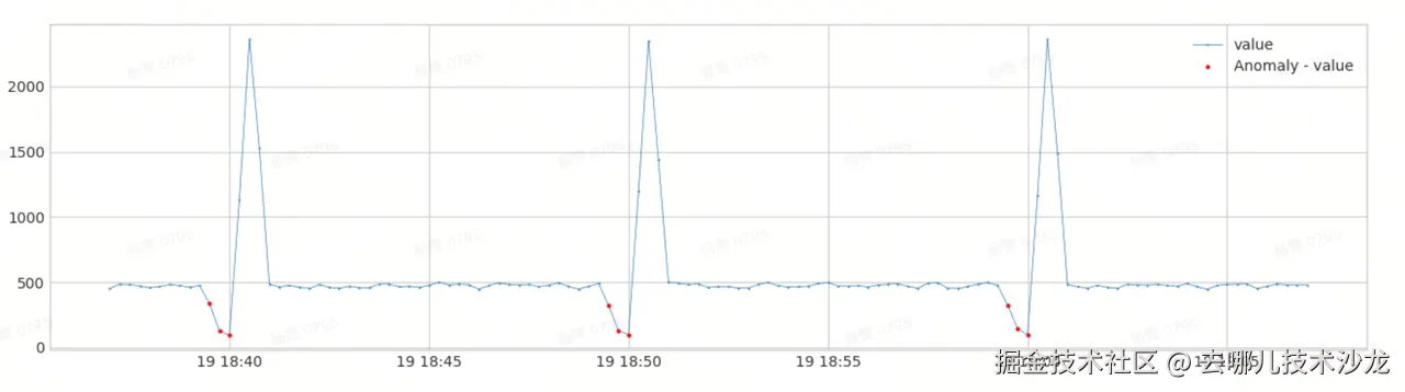 在做这种突然掉为0的极端变化异常检测时,还需要考虑周期性和先突增又突降的情况: