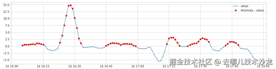 对于这种情况我们重点关注的是连续周期的变化趋势是不是一致的,最近的变化和之前的同周期变化有无较大差异,而对于单个周期内的增减变化不予以重点关注。通过周期性异常检测算法检测结果如下,红色的监控点是检测出来的异常点。可以看出最近一个周期的变化量明显高于前面的。
