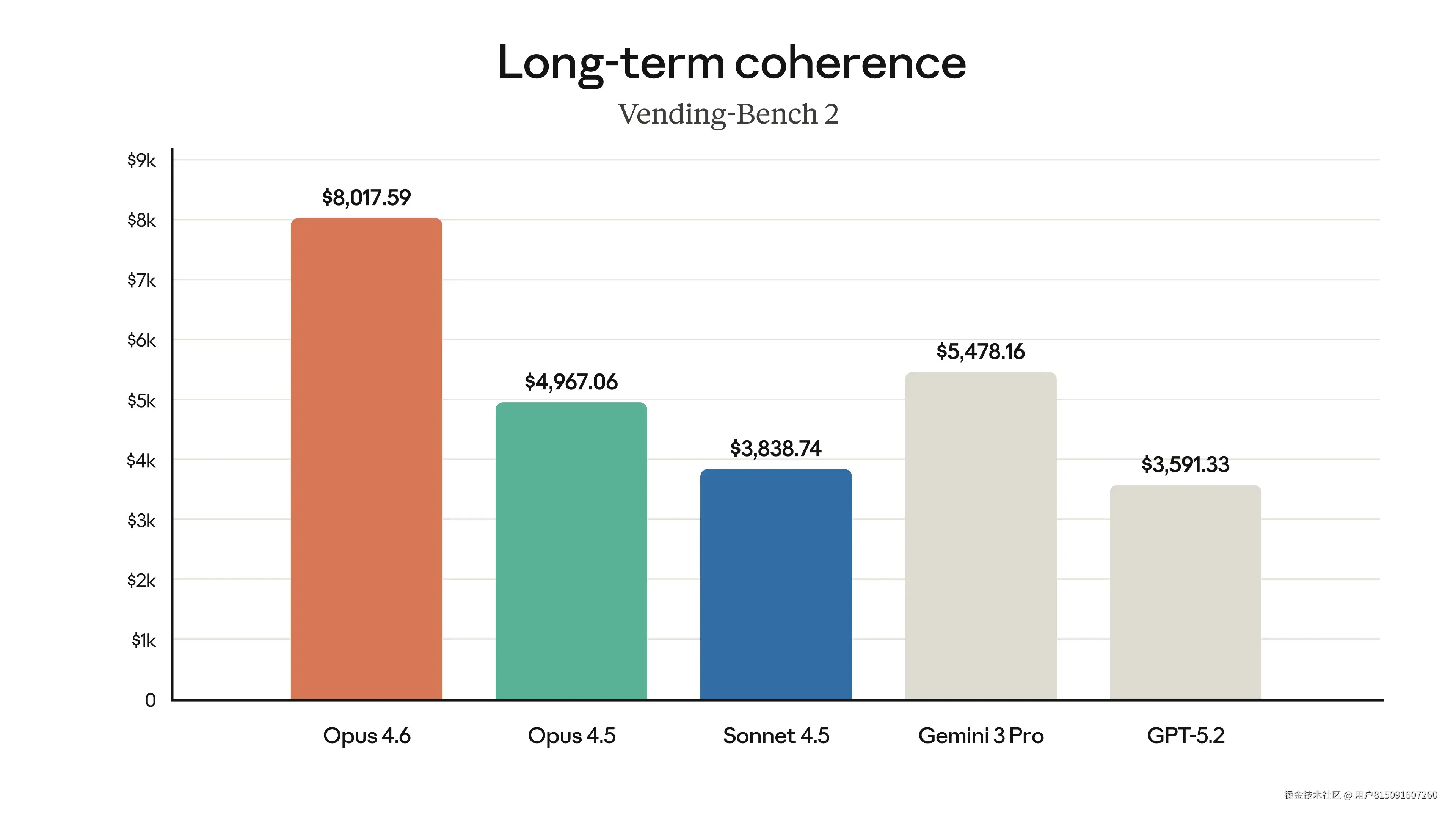 Opus 4.6 能够持续保持专注,并且在 Vending-Bench 2 上比 Opus 4.5 多赚 3,050.53 美元。