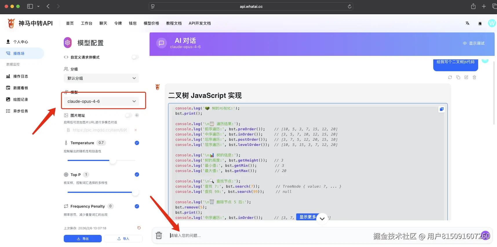 首页-工作台-操练场选择模型claude-opus-4-6,输入问题测试使用