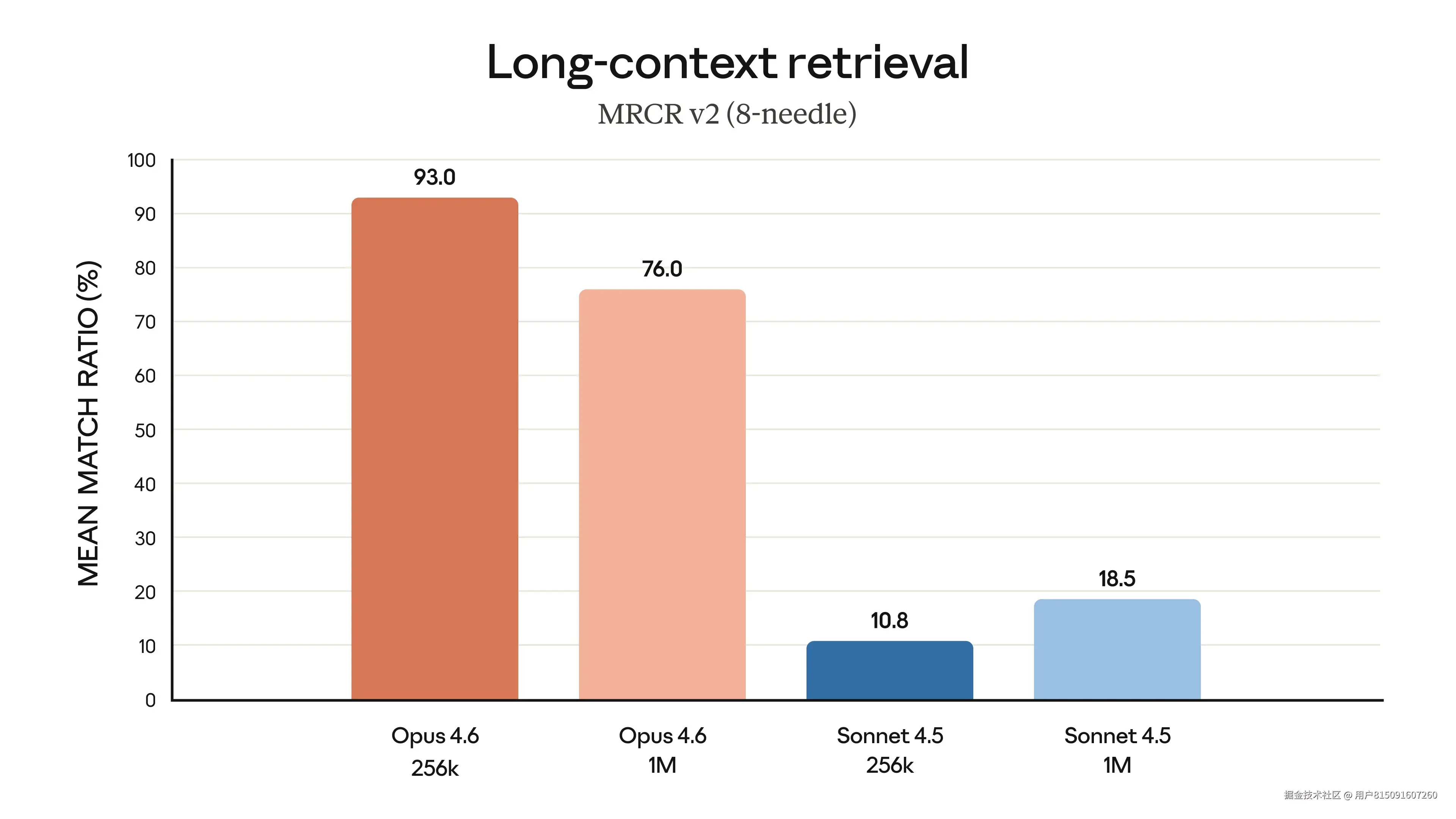 在长上下文检索上,Opus 4.6 显示出显著进步