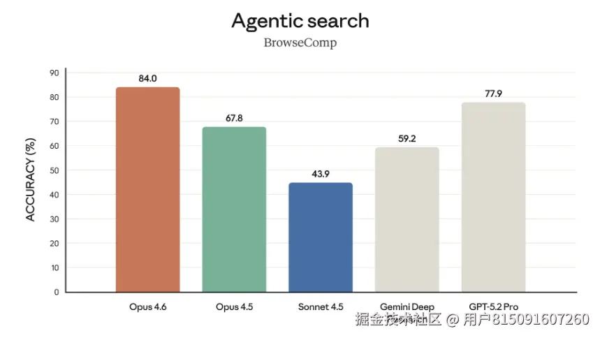 Opus 4.6 在深度、多步骤代理搜索方面获得了业内最高分。