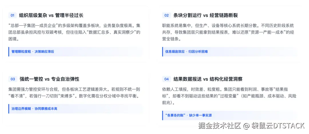 到了集团层面,上述问题进一步叠加放大,数据持续上行但语义口径不统一,指标体系不断扩充却难以横向对比、纵向追溯,分析结果更多停留在展示层面,难以真正嵌入资源配置、考核机制与管理动作之中。这种状态下,企业对外部不确定性的感知能力持续增强,对内部运行复杂性的掌控能力却并未同步提升,成为当前能源矿产行业普遍面临的系统性挑战。